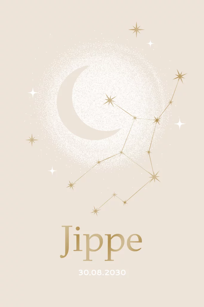 De naam en het sterrenbeeld worden gedrukt met hoogglans inkt en liggen als het ware op het ontwerp. Bestel een proefdruk om dit speciale effect in het echt te zien en pas het geboortekaartje naar wens aan.