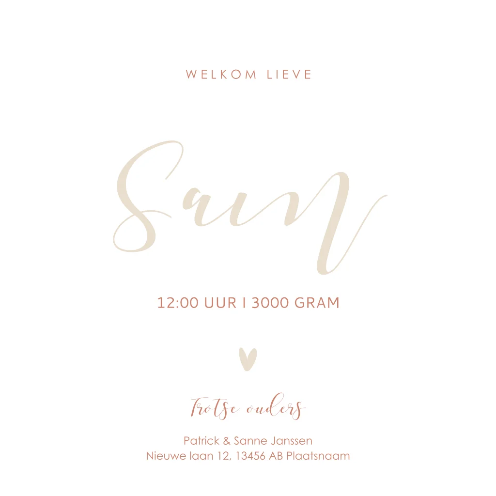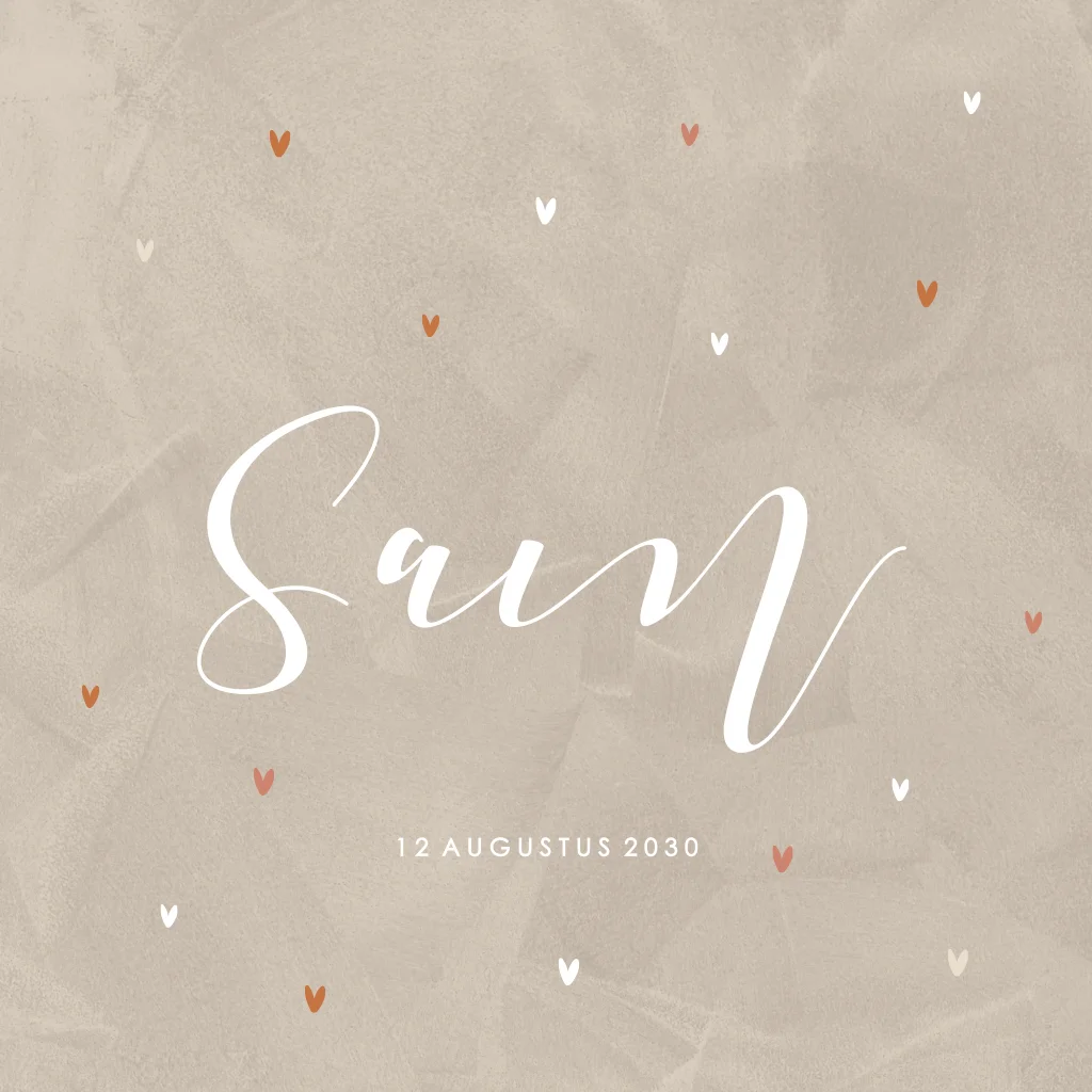 Laat de geboorte van jullie kleintje stralen met dit neutrale en minimalistische geboortekaartje, versierd met schattige hartjes. Dit hippe en stijlvolle ontwerp is perfect voor zowel een jongen als een meisje. Het geboortekaartje heeft een zachte beige achtergrond en subtiele accenten van kleine hartjes rondom de naam van jullie nieuwe aanwinst.