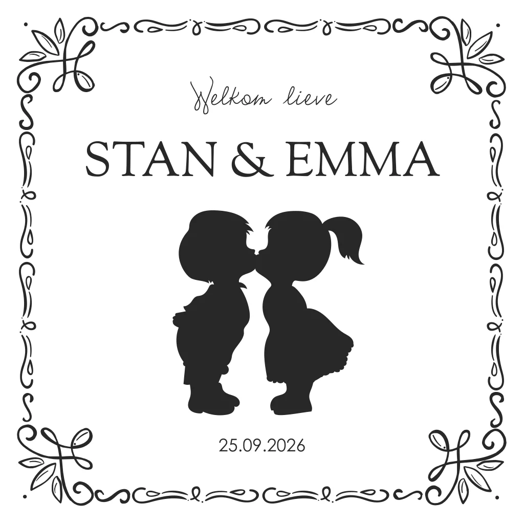 Lief en klassiek geboortekaartje met silhouetten van een tweeling, een broertje en een zusje die elkaar een kusje geven met rondom mooie ornamenten.