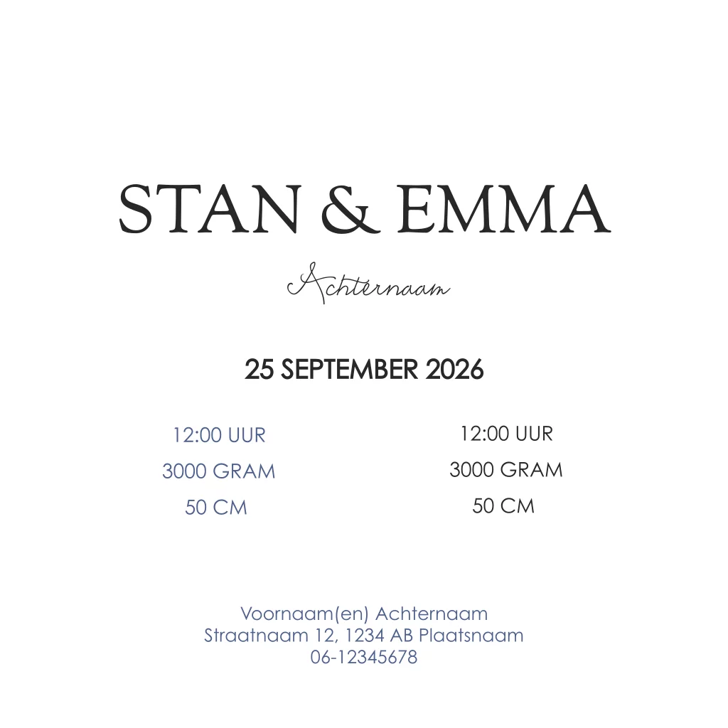 Krijg jij een jongetje en een meisje? Alle silhouet en kleuren en geboorte-informatie kun je zelf helemaal aanpassen. Zo maak je zelf de liefste klassieke geboortekaartjes voor je tweeling bij Luckz.