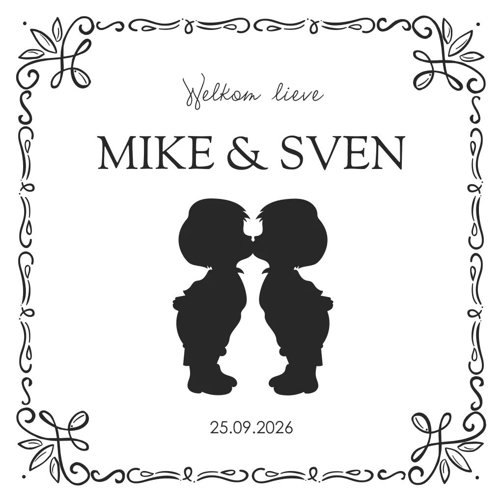 Hip geboortekaartje van een tweeling met silhouetten van twee jongens in oud-Hollandse stijl. Met twee kleine broertjes die elkaar een kusje geven en rondom de jongens illustratie staan klassieke Hollandse ornamenten.