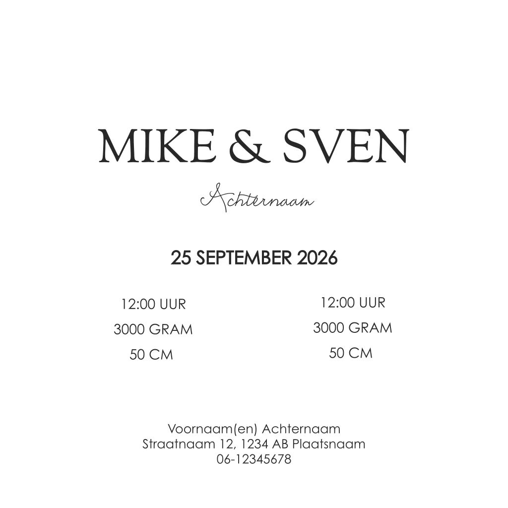 Kijk voor andere tweeling combinaties zoals twee meisjes bij onze geboortekaartjes collectie.