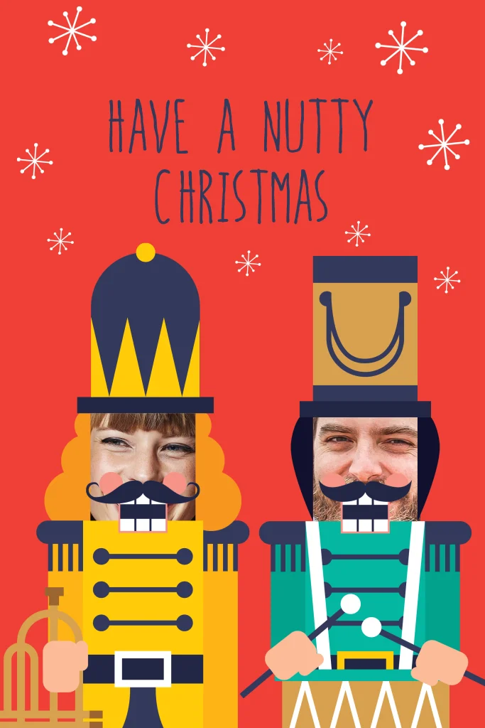 Pas de foto gezichten aan en bekijk hoe jij eruit ziet als een echte vintage notenkraker. Stuur de unieke kerstkaart per post en Wens iedereen een gekke (nutty) nutcracker kerstmis.