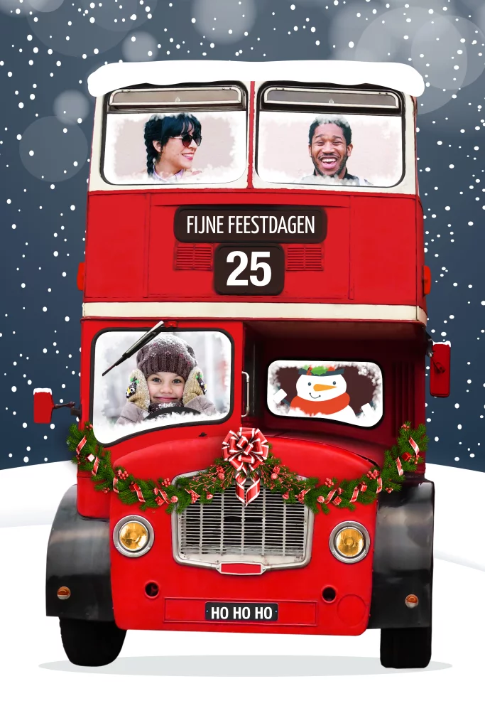 Originele grappige kerstkaart met een leuke auto bus waarin je drie of vier van je eigen foto's kunt zetten. Met leuke kerst elementen zoals dennentakken. De teksten op de bus en in de kerstkaart kun je ook allemaal zelf personaliseren.
