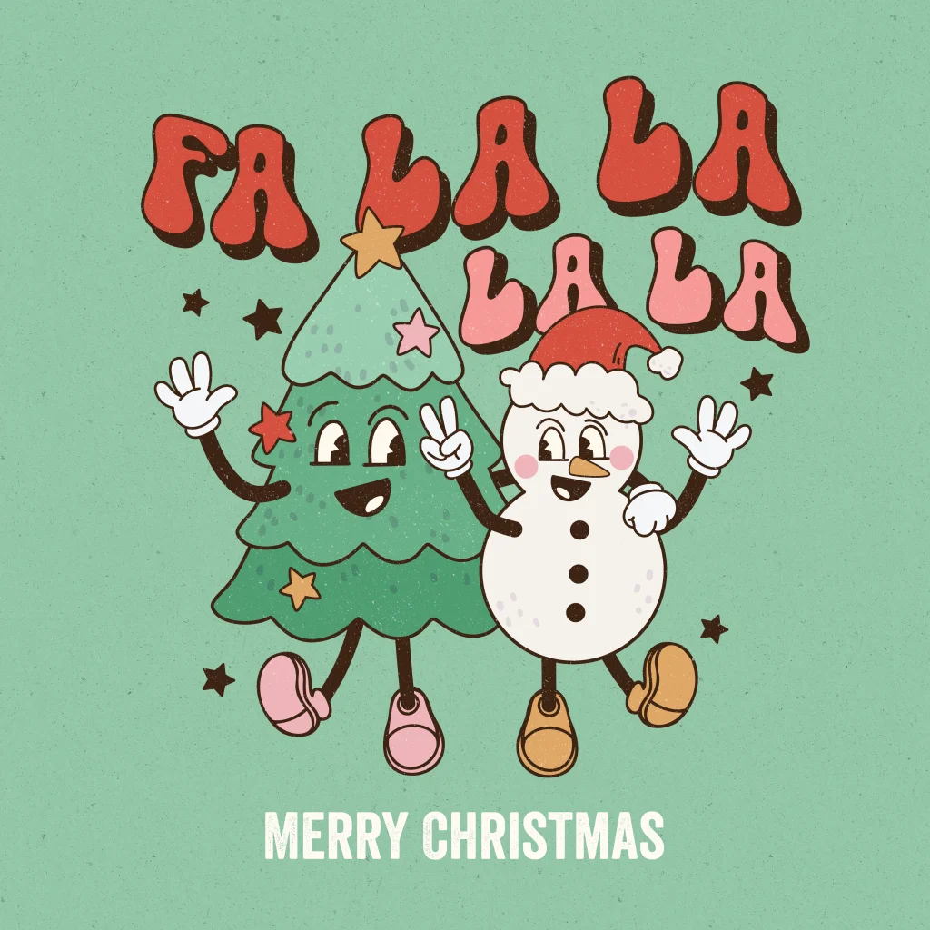 Hippe retro kerstkaart in cartoon stijl met een vrolijke kerstboom en sneeuwpop en leuk retro lettertype Fa la la la la in rode en groene kleuren.