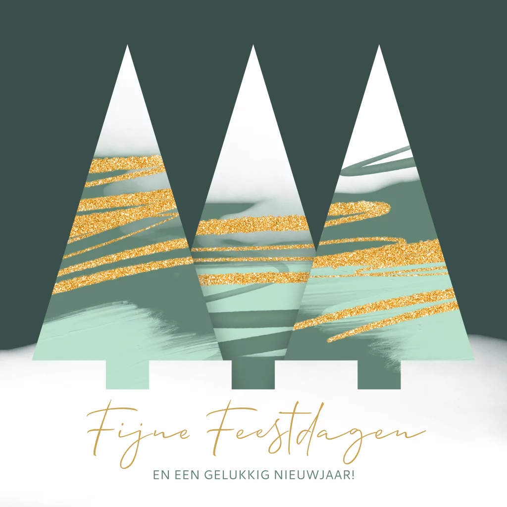 Bekijk dit unieke kerstkaarten ontwerp met mooie abstracte kerstbomen Gemaakt van sierlijke witte sneeuw met groene met gouden verf vegen.