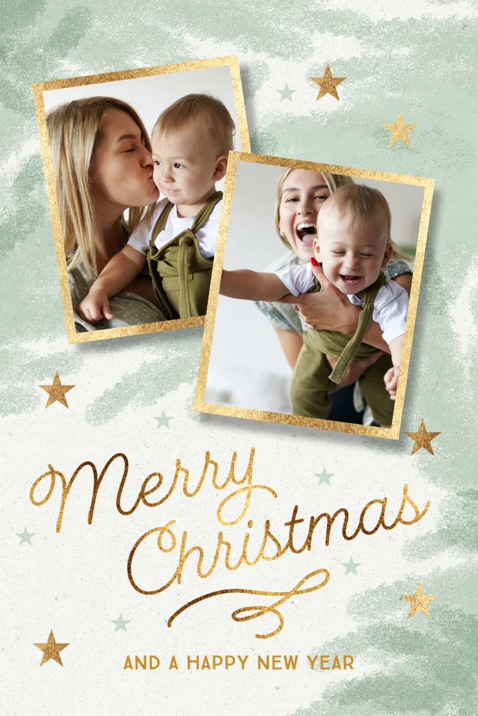 Stuur deze lieve aquarel kerstkaarten met twee foto's naar alle vrienden en familie. Met een design van mooie aquarel vegen als dennen takken van groen en beige met wit, goud look typografie.