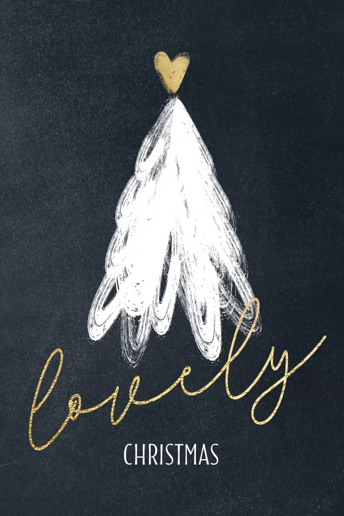 Bijzondere kerstkaart met een hippe kerstboom en een gouden hartje in krijt getekend op een krijtbord look ondergrond.