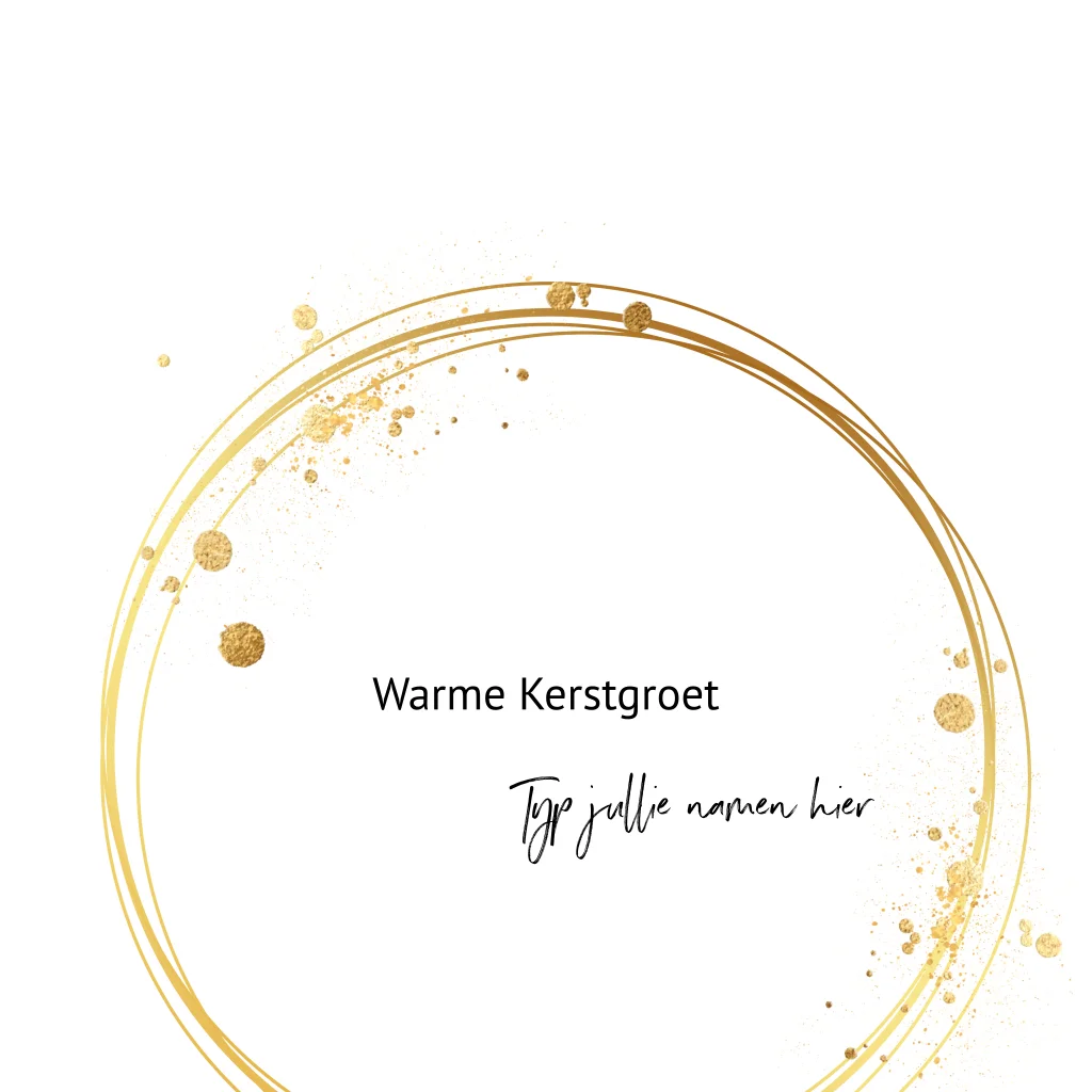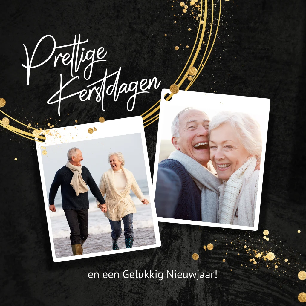 Chique kerstkaart met twee aanpasbare foto's en teksten. Deze kerstkaart heeft een luxe uitstraling door de gouden cirkel versieringen en spetters op een zwarte achtergrond.