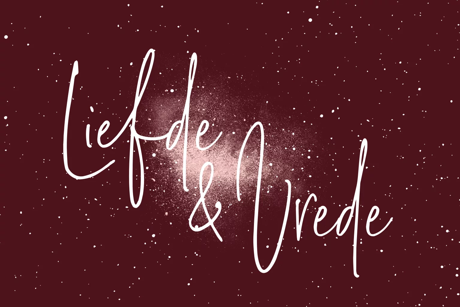 Een stijlvolle typografische kerstkaart met een christelijke kerstwens om liefde en vrede mee te wensen. Met een bordeauxrode ondergrond en sterrenhemel.