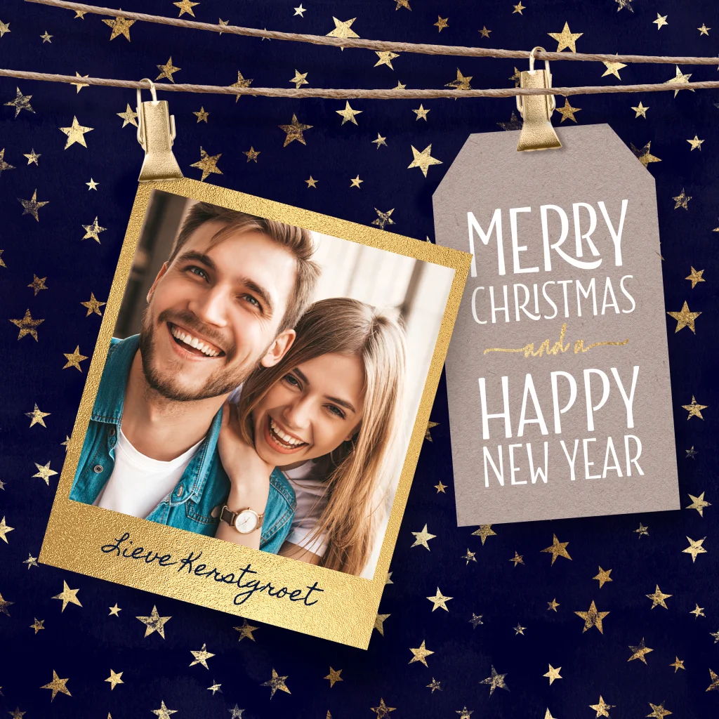 Maak deze feestelijke kerstkaarten met foto en leuke kerstgroet in een groot label. Met mooie gouden fotoframe en donker blauwe kleuren met kleine sterretjes. Alles kun je zelf eenvoudig personaliseren.