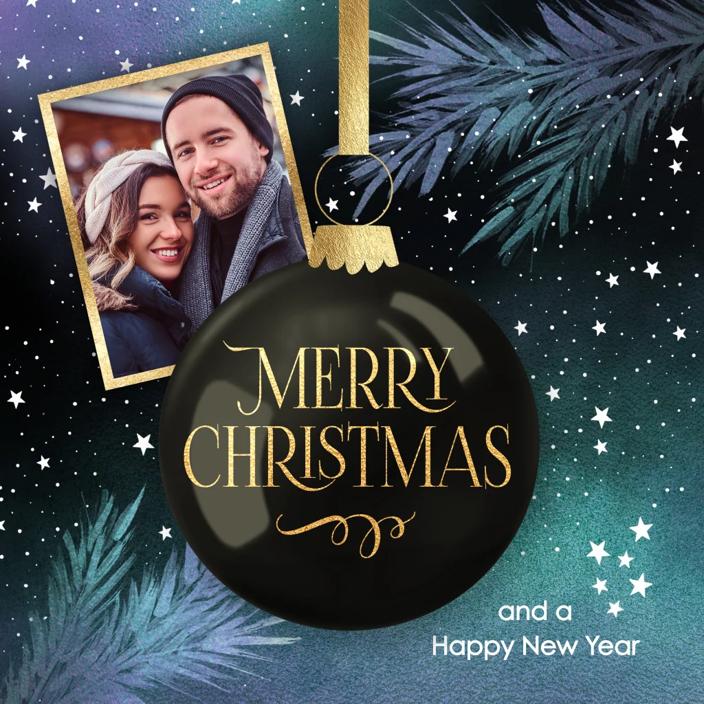Mooie foto kerstkaart en grote Merry Christmas kerstbal in het zwart. De foto staat in een mooi goud look effect frame, kleurrijke dennentakken aan de zijkanten. Op een schitterende sterrennacht achtergrond van kleine witte sterretjes op een mooie glanzende heelal kleurige ondergrond van mooie zeegroene, paarse en zwarte kleuren.