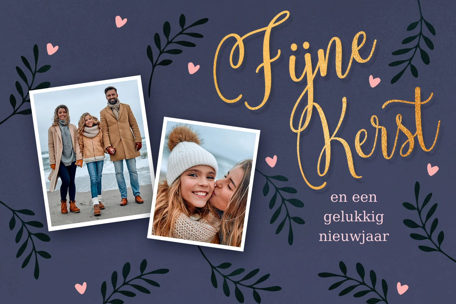 Mooie foto kerstkaarten met gouden fijne kerst in sierlijke letters, met rondom kleine lieve roze hartjes en klassieke botanische kerst takjes op donker blauwe kleuren.