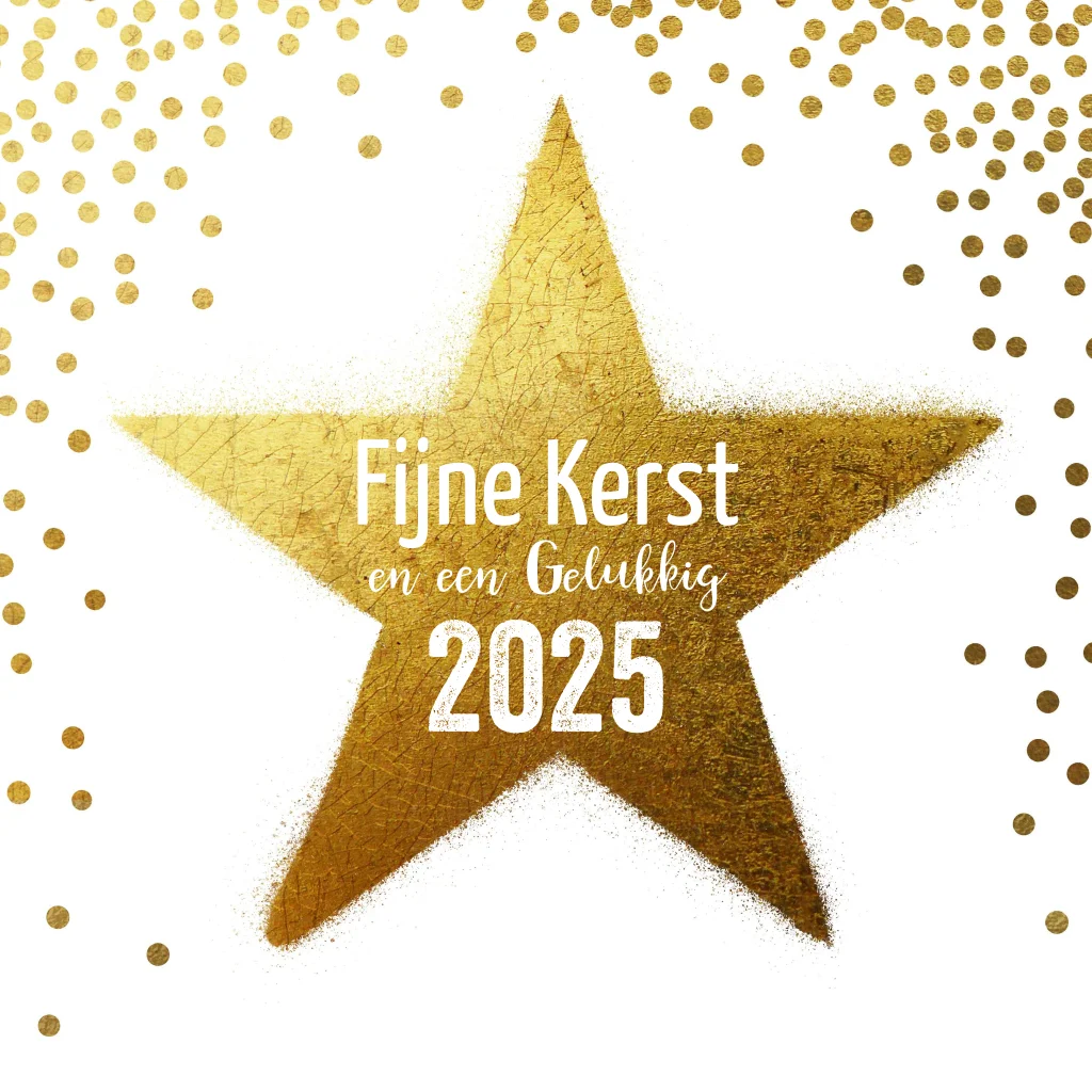 Mooie wit met gouden kerstkaart met jaartal 2025. Wens iedereen een Fijne kerst en een gelukkig nieuwjaar met deze chique kerst en nieuwjaarskaart voor 2025 met grote gouden ster.
