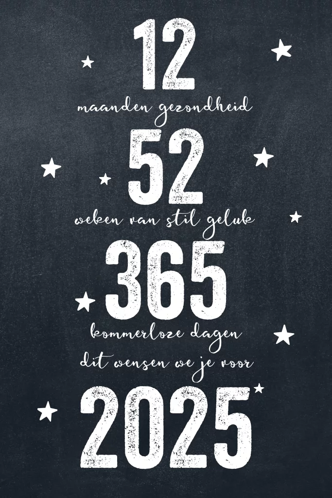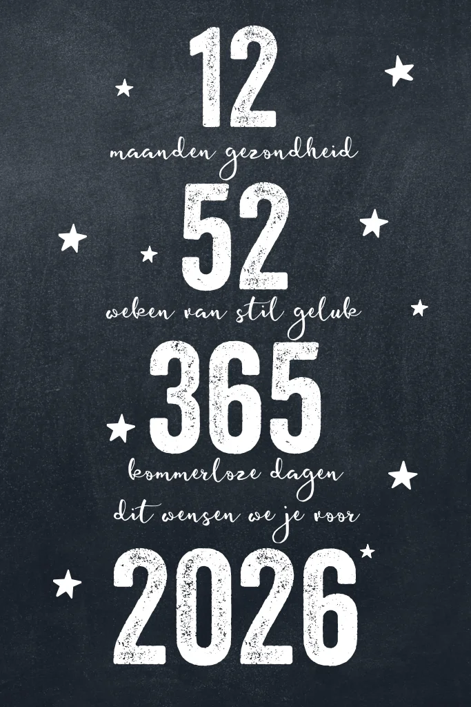 Op een krijtbord achtergrond staat de leuke nieuwjaarstekst:
