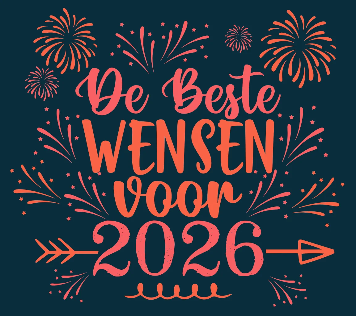 Met de kerst tekst: De beste wensen voor 2026 en leuke vuurwerk versieringen rondom.