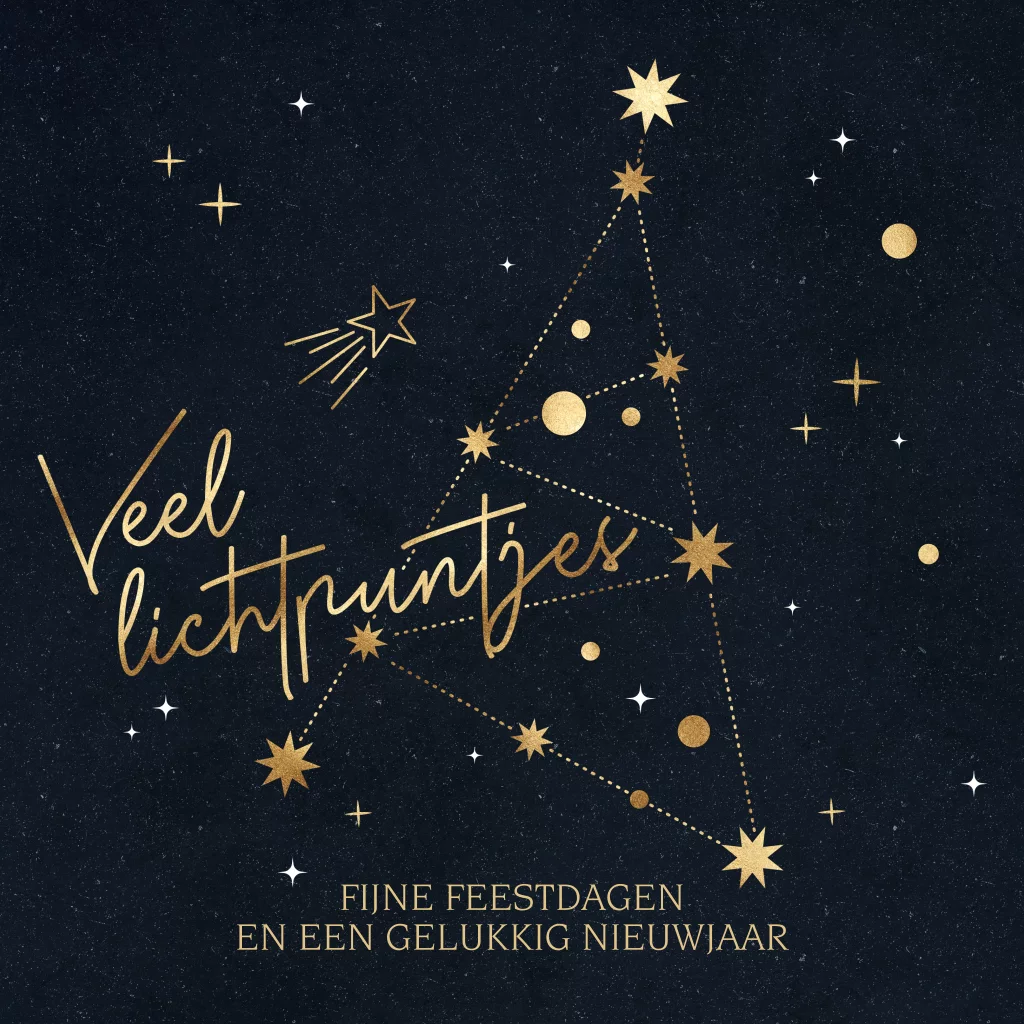 Met een mooie gouden en donkerblauwe kleurencombinatie en lieve kerstwens met “Veel lichtpuntjes” Pas de binnenkant naar wens aan en verstuur deze hippe kerstkaart naar alle vrienden, familie of naar alle zakelijke relaties als mooie bedrijfs kerstkaart.