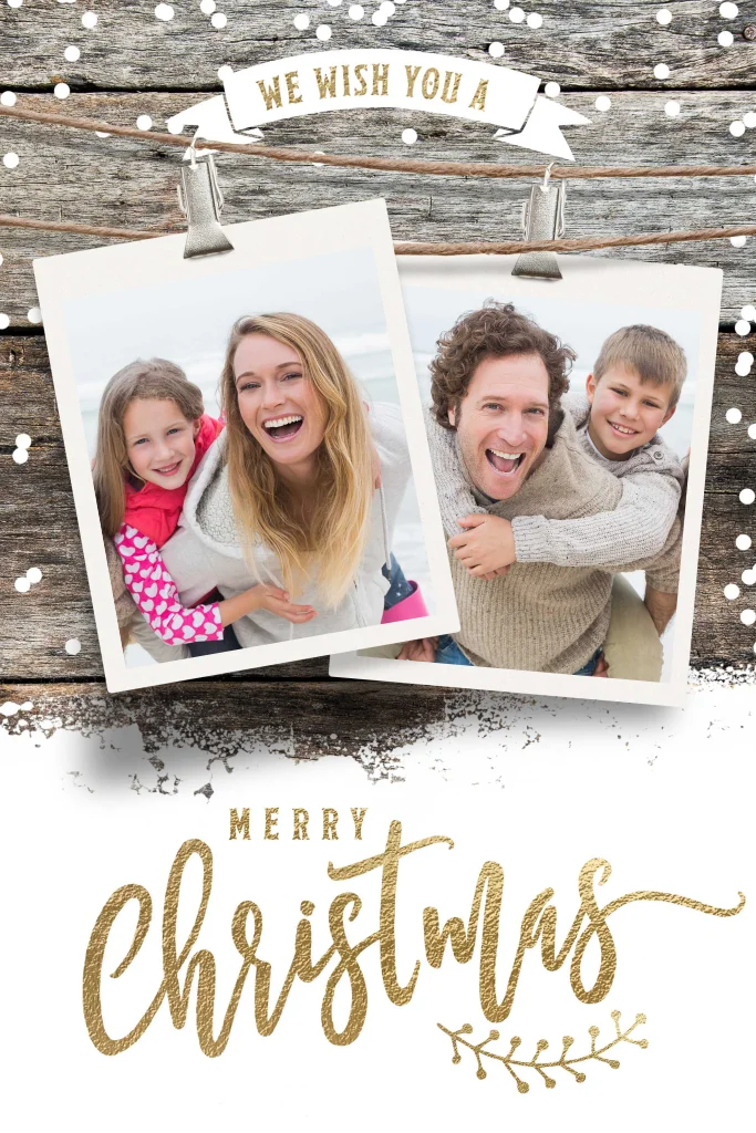 Maak deze hippe kerstkaarten met twee eigen foto's op een houten sneeuw ondergrond met leuke typografische elementen. Schrijf je eigen kerstwens in de binnenkant.