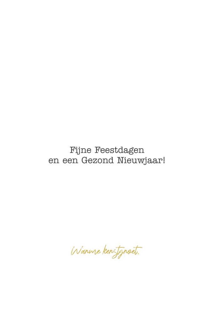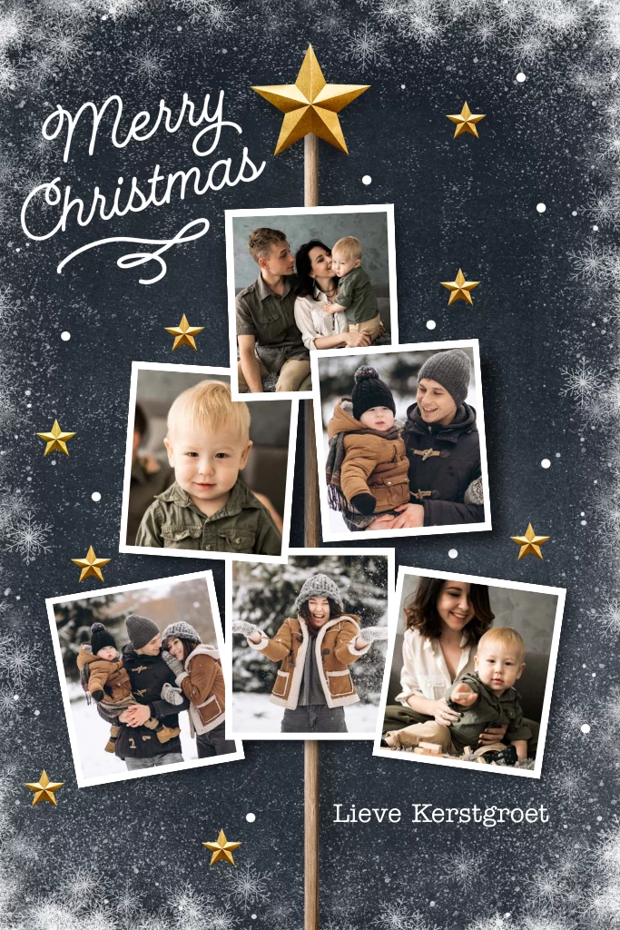 Zet zes van je eigen foto's op de voorkant in de fotocollage kerstboom, met rondom leuke sneeuwvlokken en gouden sterren en schrijf een leuke kerstgroet en namen op de kerstkaart en verstuur hem naar alle vrienden en familie.