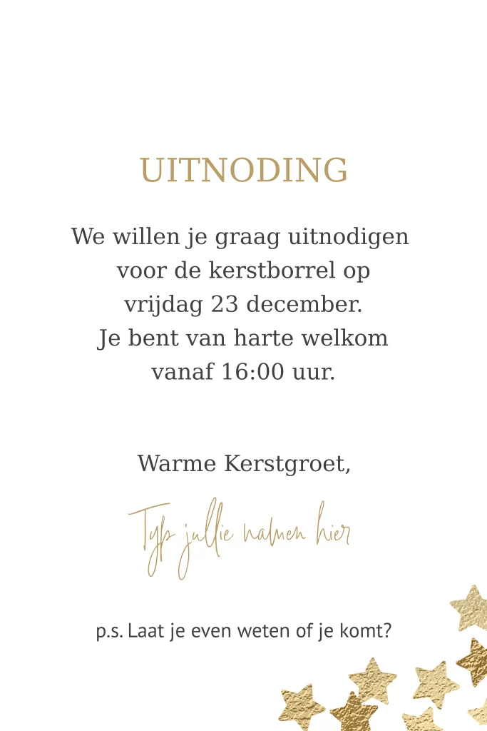 Een kerstborrel uitnodiging met gouden kerst sterren en een licht groene ondergrond die je zelf kan personaliseren, voor de zakelijke kerst borrel of voor thuis. Met aanpasbare sierlijke typografie.
