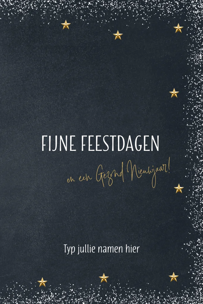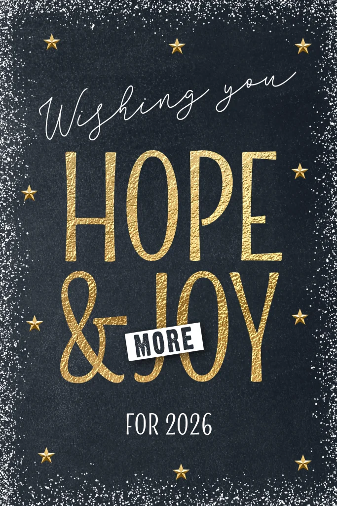 Warme kerstkaarten met een lieve Engelse kerstgroet: Wishing You Hope and more Joy for 2026. Met gouden letters en kleine sneeuwvlokjes op een krijtbord look ondergrond en kleine sterretjes in goud rondom.