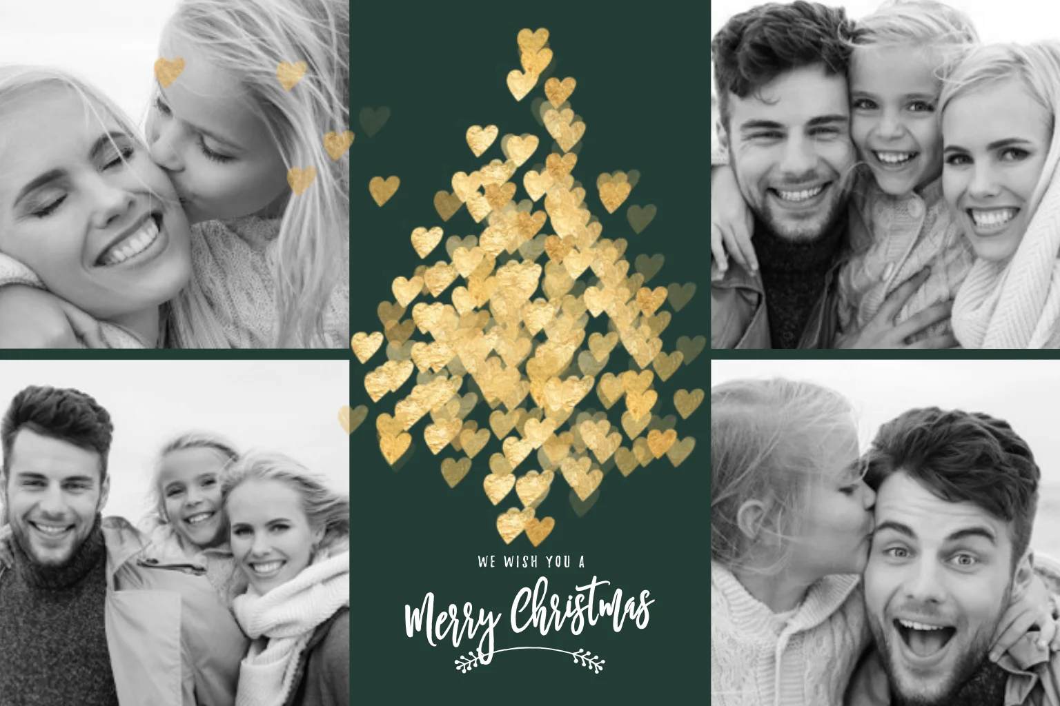 Leuke kerstkaarten met een foto collage van 4 van jouw eigen foto's op de voorkant en een mooie goud look kerstboom in hartjes op de voorkant.
