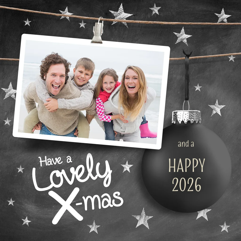 De zwarte krijtbord achtergrond laten de persoonlijke foto van je gezin echt uit deze originele kerstkaart springen. Hangend aan een waslijn samen met een zwarte kerstbal. Onder aan de kerstkaart een lieve kerstgroet "Have a lovely X-mas and a Happy 2026" voor de ontvanger van de kerstkaart.