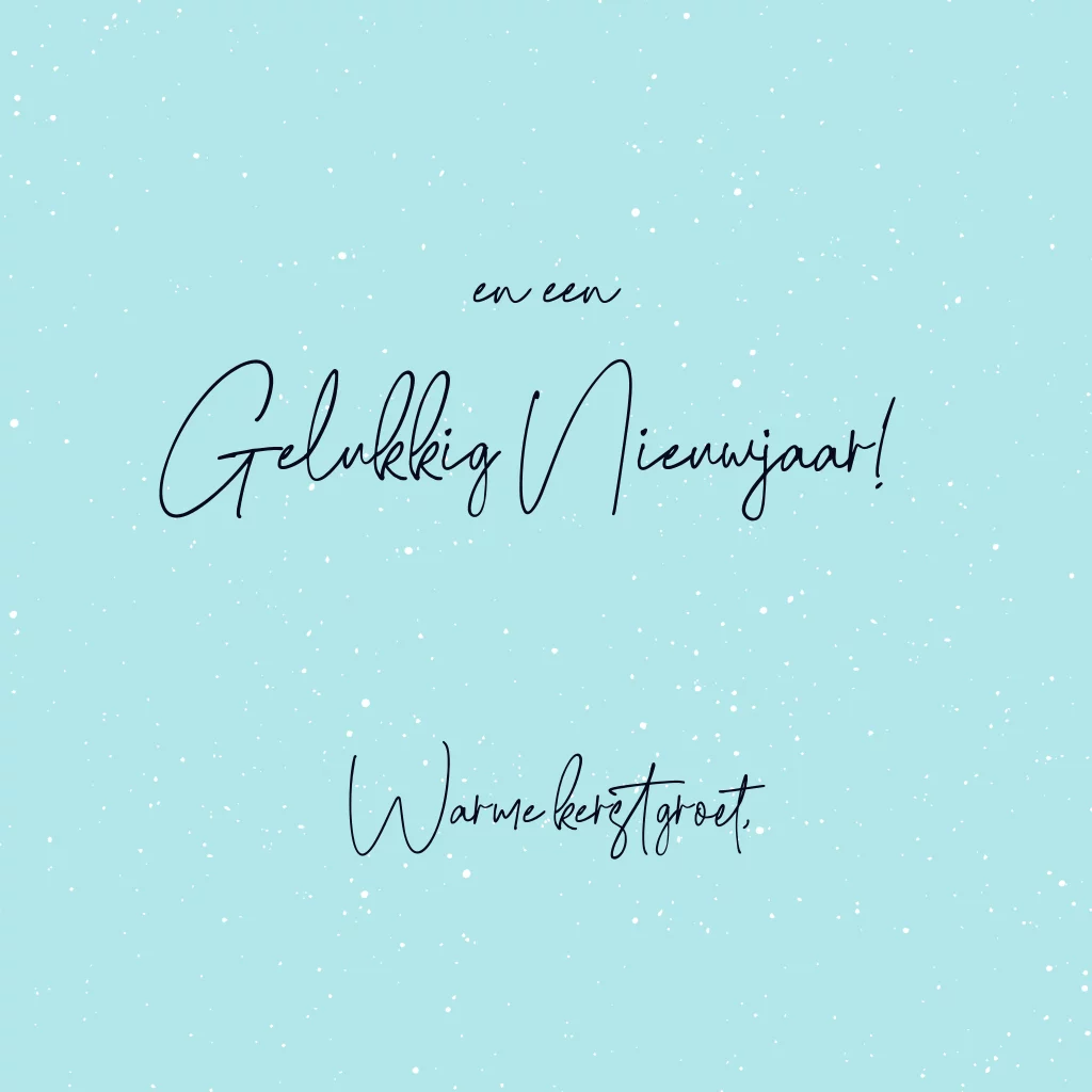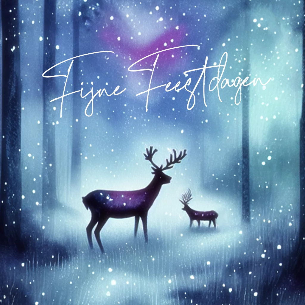 Unieke kerstkaart met twee hertjes midden in een dennenbos in dromerige waterverf kleuren paars, blauw en wit en rondom sneeuwvlokjes.