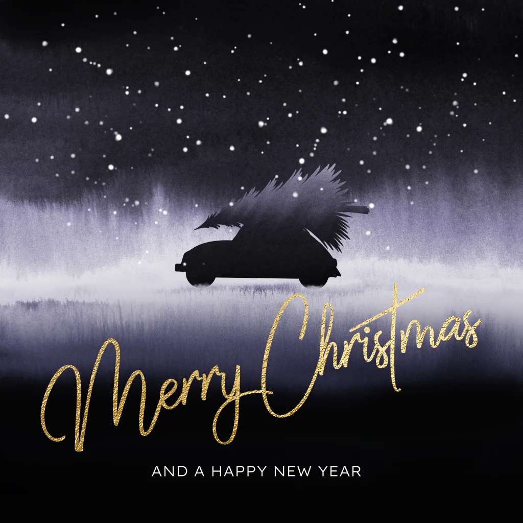 Mooie hippe kerstkaart met een kerstboom op een auto in silhouet in een mooie donkere zwart-wit waterverf aquarel stijl met vallende sneeuw en kerstwens. De mooiste kerstkaarten maak je zelf bij Luckz.