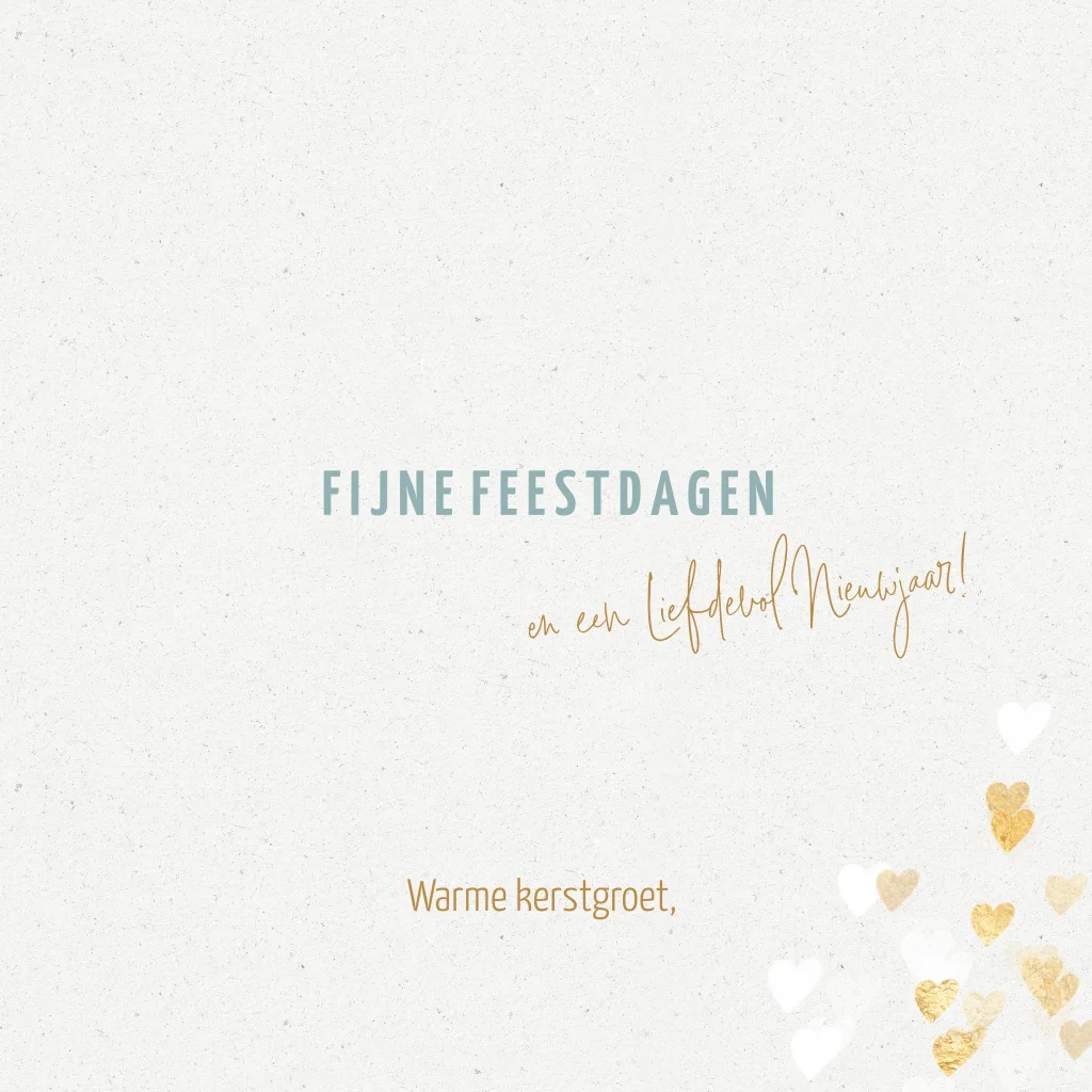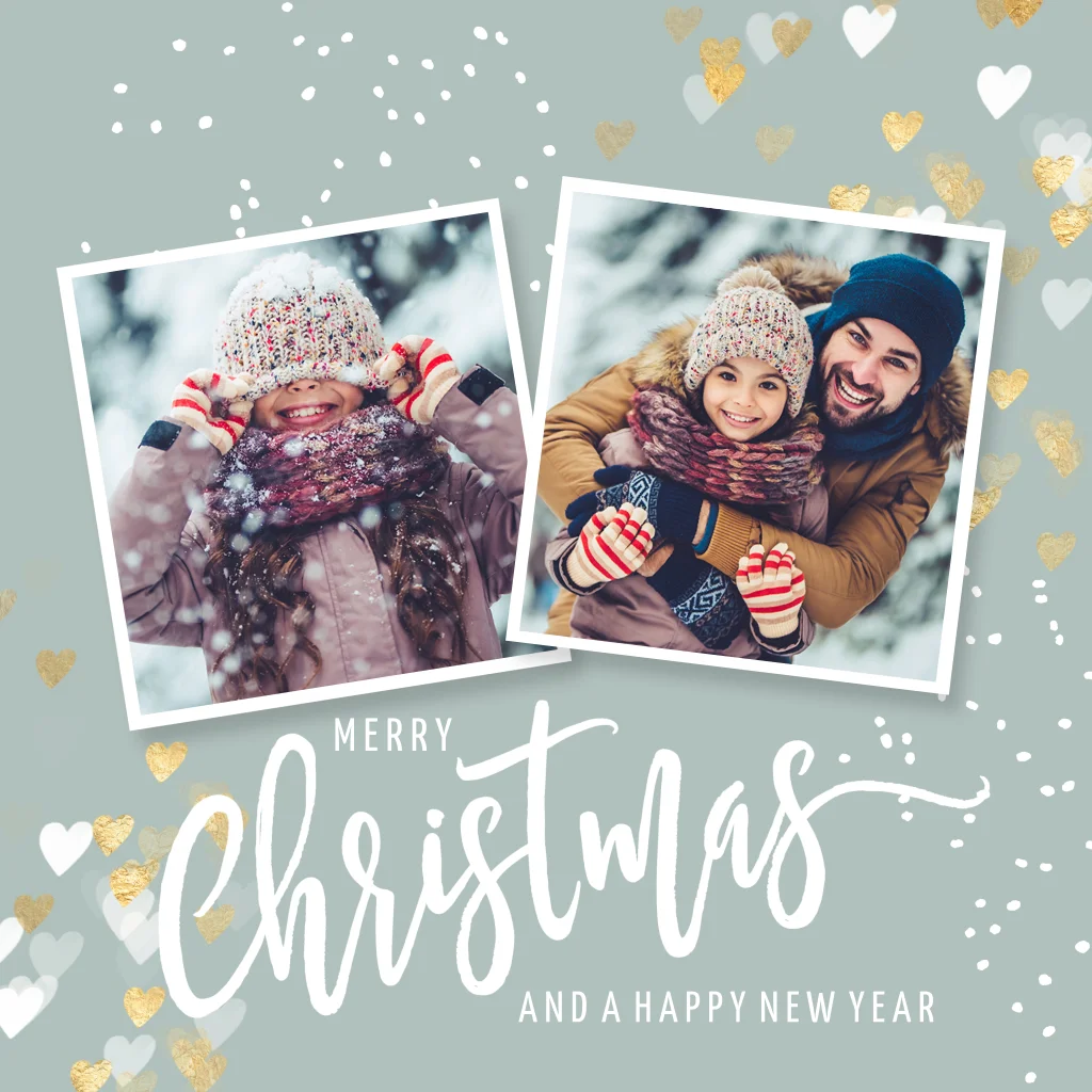 Lieve kerstkaart met kleine gouden en witte hartjes, dwarrelende sneeuw en je eigen kerst foto's op de voorkant. Maak leuke selfies of kies een persoonlijke winter foto en zet ze gemakkelijk in deze mooie kerstkaart.