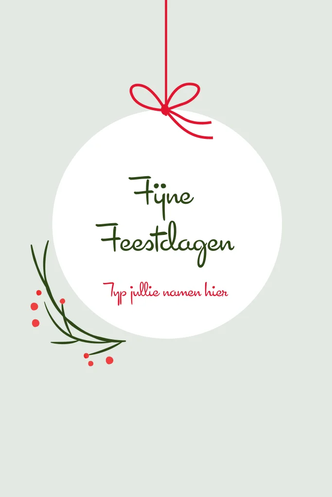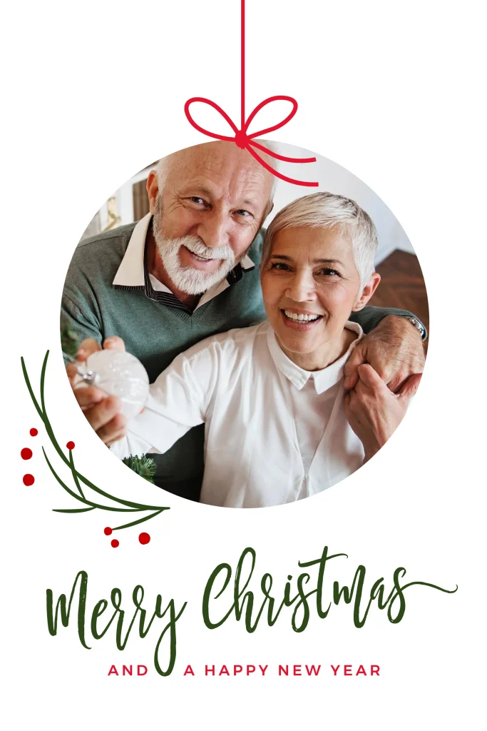Maak zelf deze originele kerstkaart met je eigen persoonlijke kerstfoto op de voorkant in de vorm van een kerstbal. Alles is gemakkelijk te personaliseren met de editor. Met leuke kerst ornamentjes, takjes en de tekst "Merry Christmas".