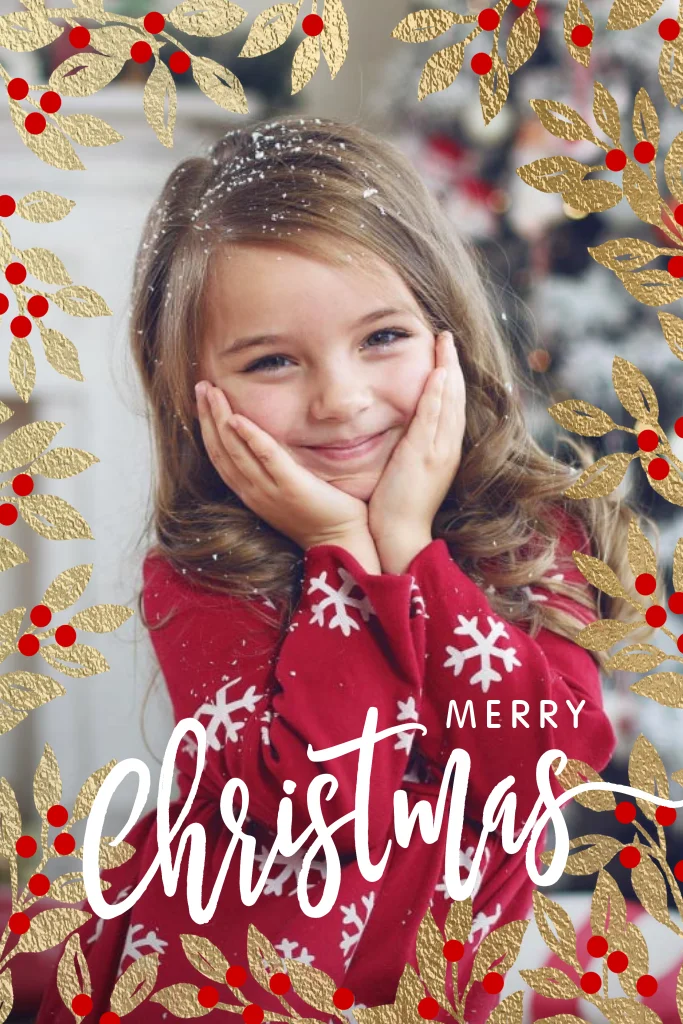 Maak je eigen unieke kerstkaart met je eigen foto op de voorkant omringt door gouden mistletoe takjes.