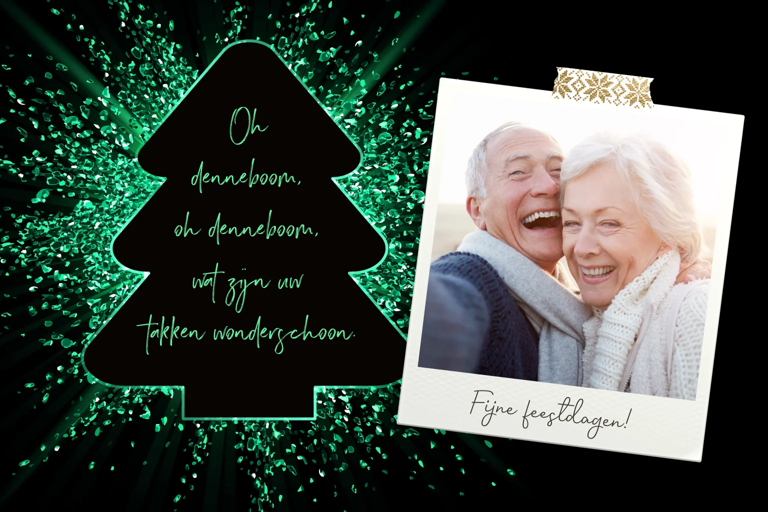 Maak deze feestelijke kerstkaart met een sprankelende groene glitter effecten en een eigen foto. Met een groot silhouet van een kerstboom met daarin een kersttekst. Typ je eigen kerstwens en namen op de kerstkaart en versturen maar.