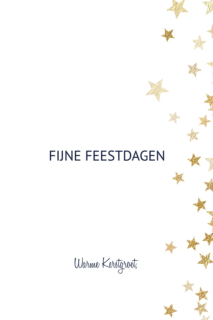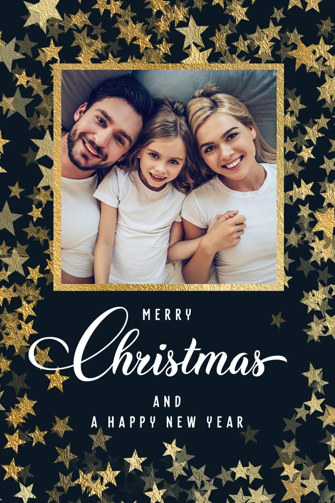 Leuke kerstkaarten met eigen foto en feestelijke gouden sterren rondom die je zelf kan maken en bestellen. Zet een persoonlijke kerstwens in de binnenzijde en zet je eigen foto op de voorkant.