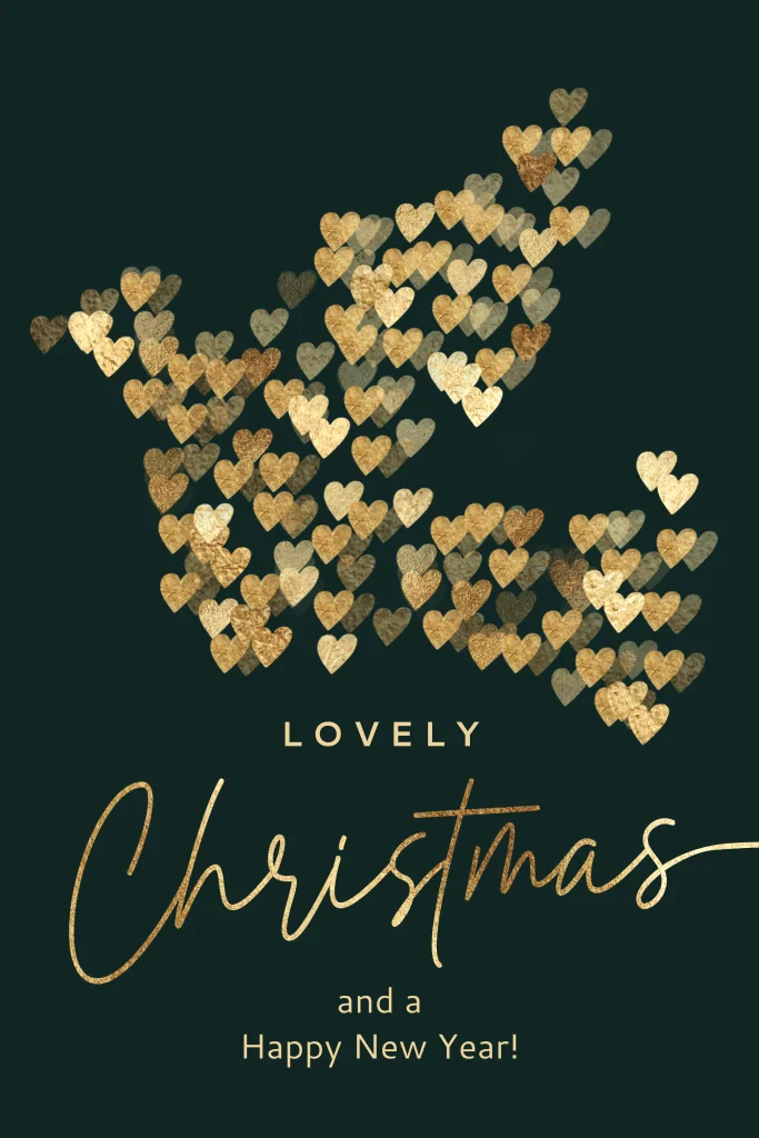 Wil jij een unieke kerstkaart verzenden naar de mensen die je liefhebt? Stuur ze deze mooie kerstkaarten met een vredesduif opgemaakt in vele kleine gouden hartjes.