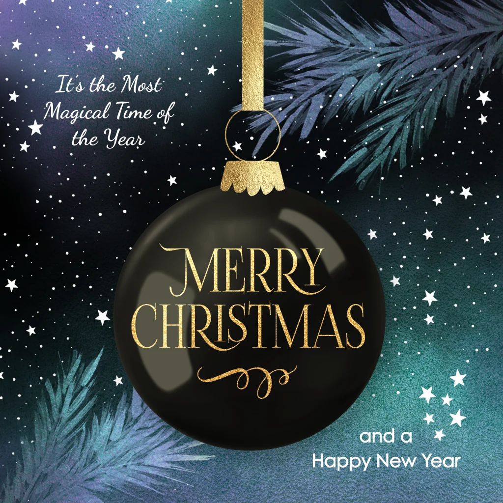 Maak deze mooie kerstkaarten met een grote zwarte kerstbal met Merry Christmas in een sierlijk goud look lettertype op een sterren nacht ondergrond en een kerstwens naast de kerstbal die je ook kan personaliseren. De schitterende sterren nacht heeft stijlvolle glans effect kleuren van paars, zeegroen en zwart.
