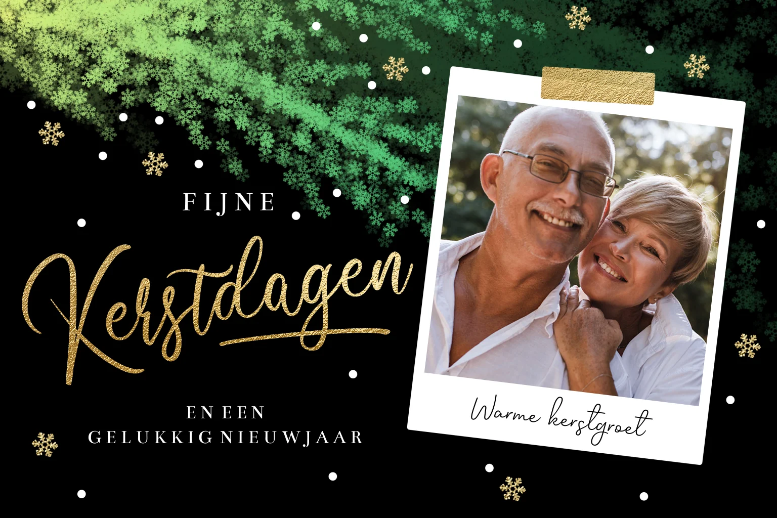 Maak en stuur deze leuke kerstkaart met eigen foto en sprankelende kersttakken opgezet uit kleine sneeuwvlokjes. Met de kersttekst: Fijne Kerstdagen en een gelukkig Nieuwjaar.