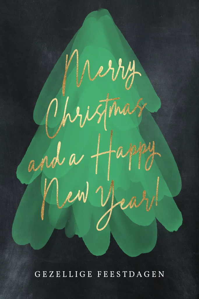 Originele kerstkaarten met mooi ontwerp van een grote groene kerstboom gemaakt van krijtverf vegen en een sierlijke gouden kerstwens: Merry Christmas and a Happy New Year. Zet je eigen teksten in de binnenzijde van de kerstkaart.