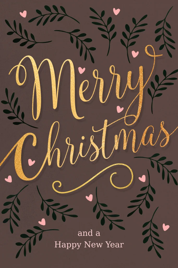 Verstuur deze sierlijke kerstkaart met groot in goud look de wens Merry Christmas. Rondom staan kleine lieve roze hartjes en hippe botanische kersttakjes. Zet je eigen teksten en naam op de achterzijde.