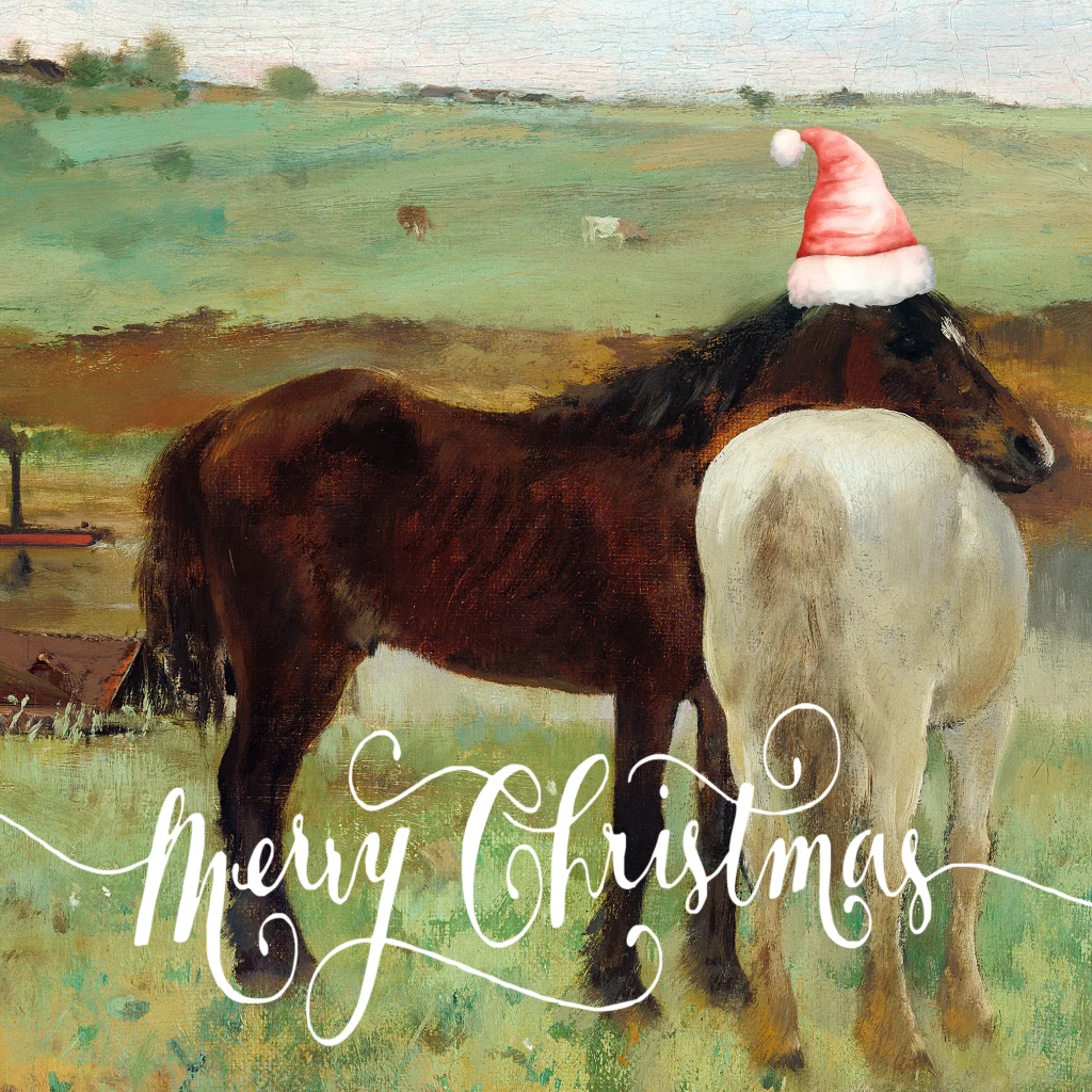 Kunst kerstkaarten met paarden en kerstmuts