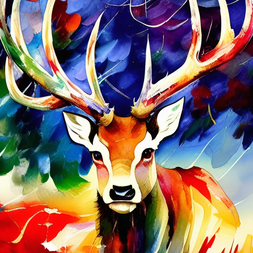 Prachtige kunst kerstkaarten met een rendier Hert in kleurrijke waterverf schilderstijl. Zet eenvoudig je eigen teksten in de binnenkant en op de voorkant.