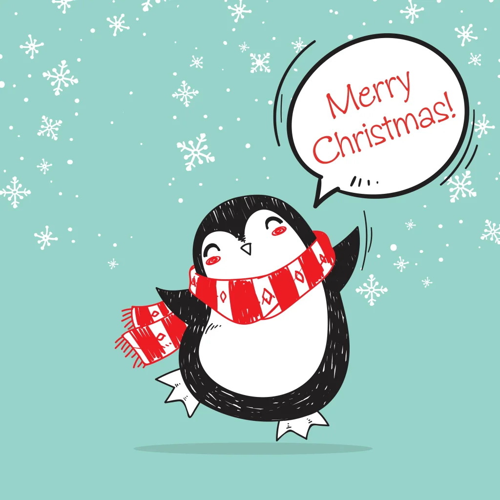 Een leuk kerstkaartje met een illustratie van een blije pinguïn. Pas zelf de kleuren en teksten aan van deze vrolijke kerstkaart.