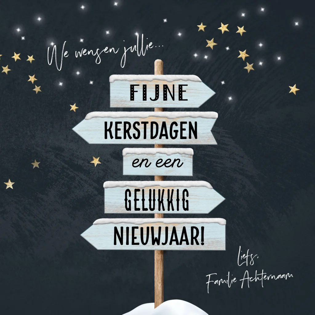 Leuke kerstkaart met een houten wegwijzer en krijtbord look design met rondom een sterrennacht en je eigen foto in de binnenkant.