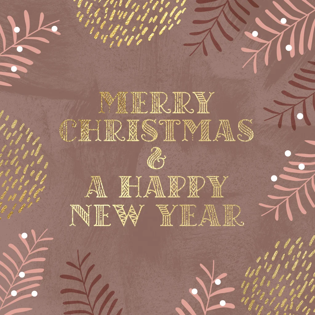 Kerstkaarten met een mooie oud roze kleur en botanische versieringen in goud, roze en terracotta tinten.