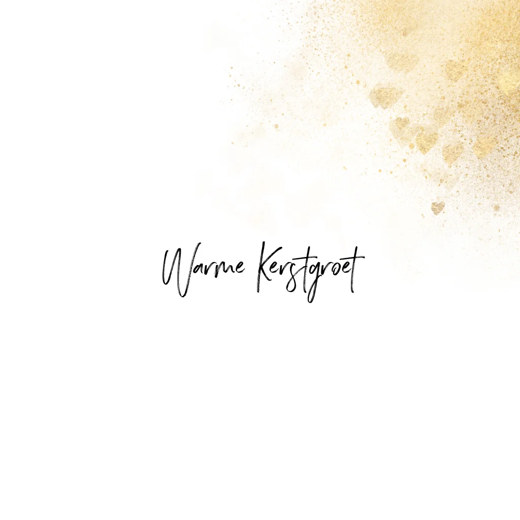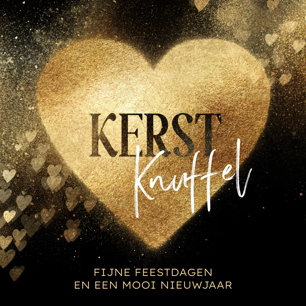 Stuur iedereen een extra knuffel in de kerstperiode met deze lieve kerstkaart. Op de voorkant staat “Kerst knuffel” op een prachtig groot gouden hart, met rondom kleine lieve hartjes, op een chique zwarte ondergrond.