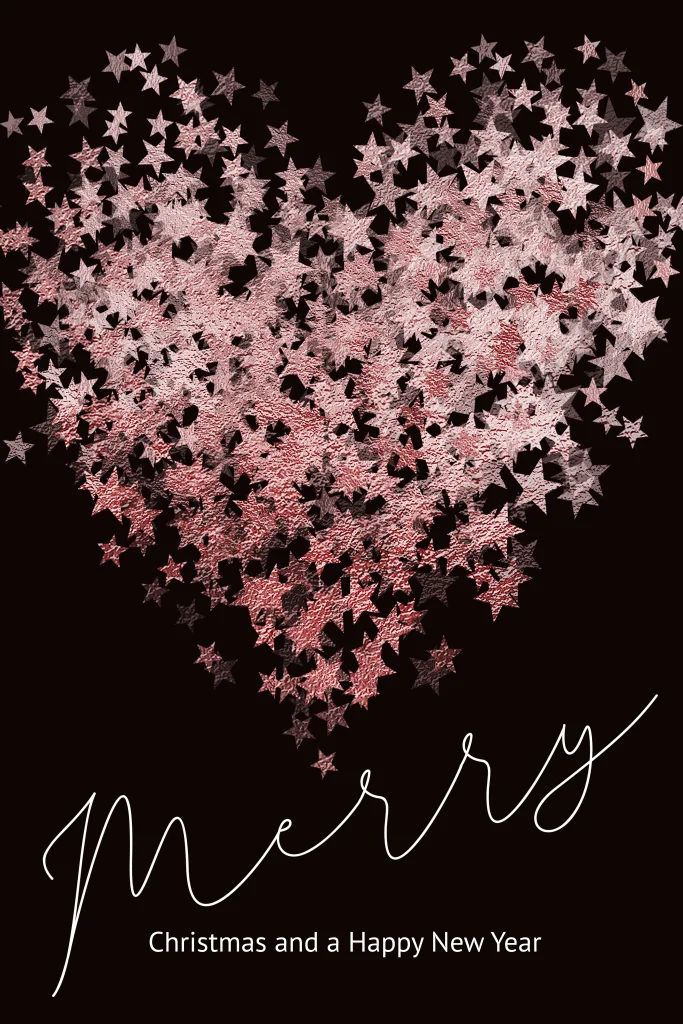 Lieve kerstkaarten met een groot roze hart design gemaakt uit honderden kleine sterretjes.
