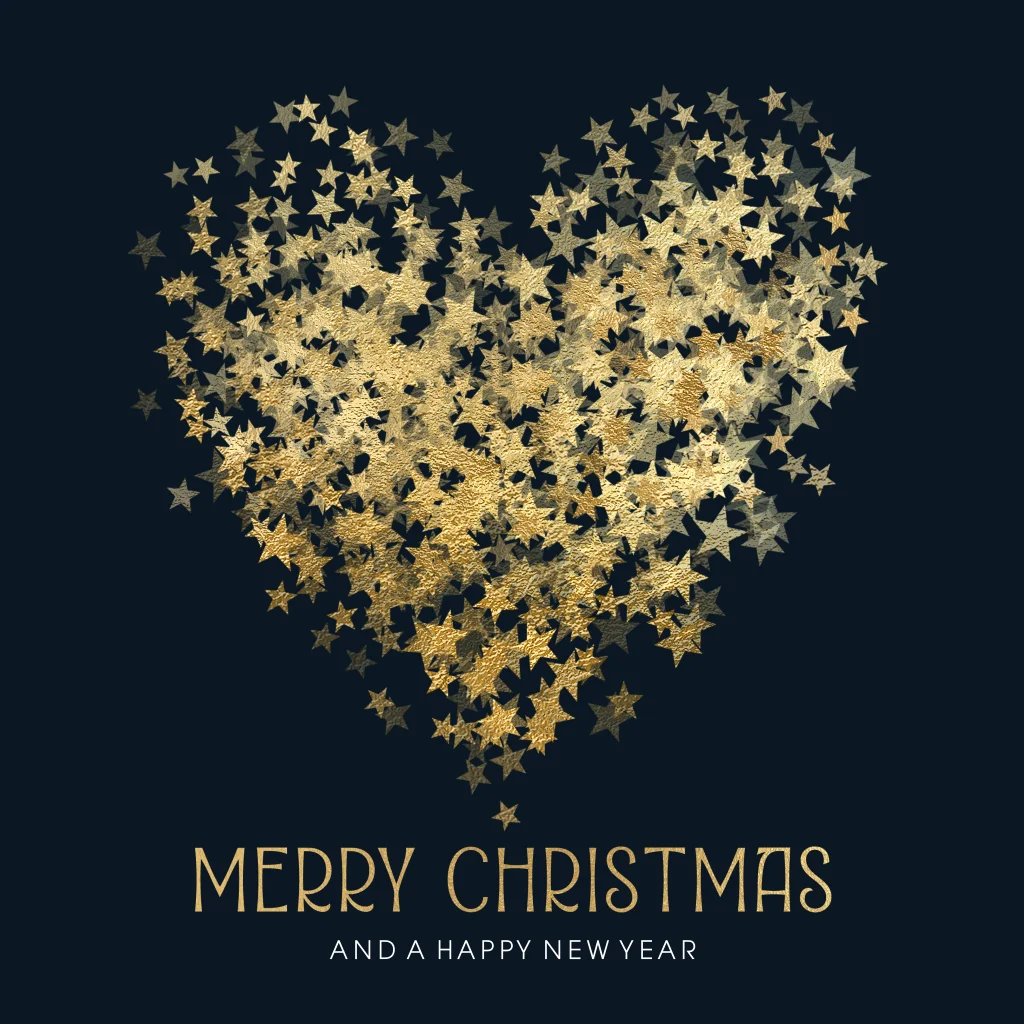 Luxe kerstkaarten met een schitterend gouden hart dat bestaat uit honderden kleine sterren. Door de donkerblauwe ondergrond springen de kleine elementen er nog mooier uit. Maak zelf een luxe kerstkaart voor de feestdagen bij Luckz!