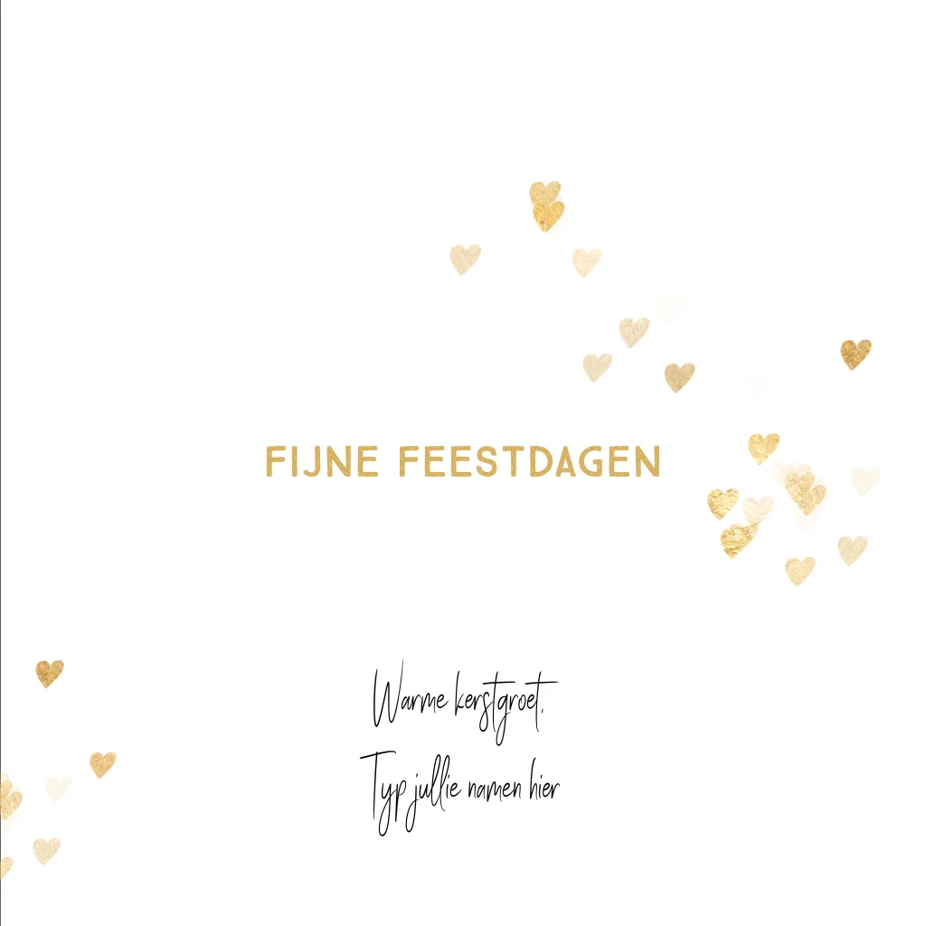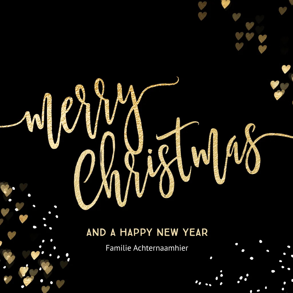 Mooie stijlvolle zwarte kerstkaarten met luxe uitstraling door de gouden typografie, hartjes en sneeuw die je zelf kan personaliseren bij Luckz.