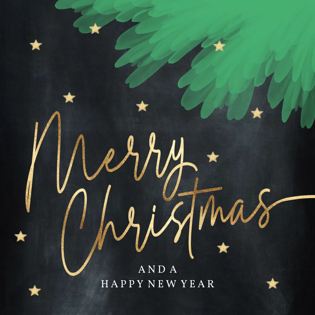 Mooie kerstkaarten met gouden Merry Christmas op de voorkant. De achtergrond heeft een zwarte krijtbord look met daarop groene kersttakken en kleine sterretjes gemaakt van verf krijt strepen.