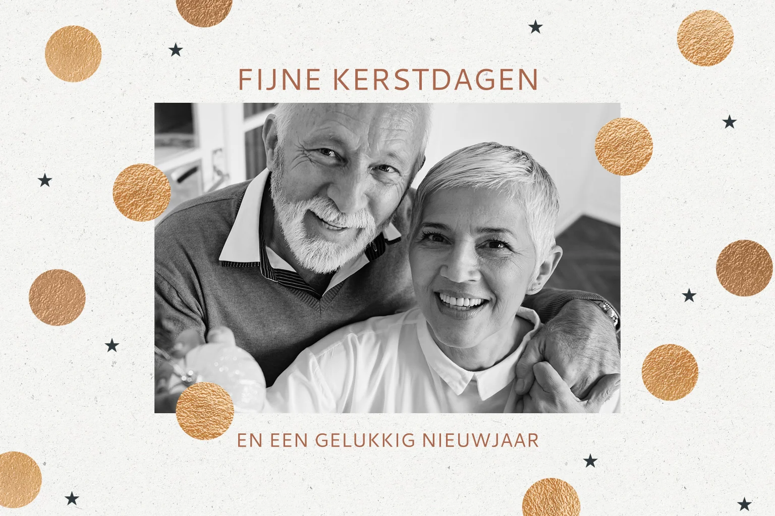 Maak en stuur deze mooie kerstkaart met foto op de voorkant die je eenvoudig kan vervangen. De achtergrond is crème met daarop mooie koper kleurige stippen en bollen. Zet een mooie kerstwens en je naam in de binnenzijde.